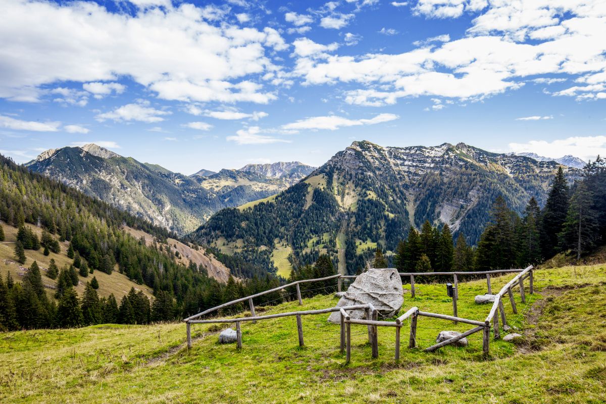 Wandern und Mathematik sind beste Freunde. Mithilfe der Mathematik lassen sich Wanderzeiten, Weglängen und Höhenunterschiede berechnen, und dank ihr ist es möglich, den exakten Mittelpunkt eines Landes zu bestimmen – den man auch besuchen kann. Zum Beispiel jenen des Fürstentums Liechtenstein. Georg Schierscher hat diesen Punkt anlässlich des «Weltjahres der Mathematik 2000» errechnet. Ein 4,5 Tonnen schwerer Findling markiert den Punkt mit den Koordinaten 760'361 / 223'297 auf der 1721 Meter hoch gelegenen Alp Bargälla. Die Wanderung zum geografischen Mittelpunkt führt über den Plattaspitz, einen unscheinbar wirkenden Gipfel mit fantastischer Aussicht auf das Fürstentum Liechtenstein, die Vorarlberger Alpen und das Rheintal. Die Tour bietet viel Abwechslung trotz relativ kurzer Wanderzeit. Nach dem Start in Steg steigt der Weg zügig an zum aktuell geschlossenen Berggasthaus Sücka. Kurz danach erreicht man den alten Tunnel, der seit 1864 den Zugang vom Tal in die Bergsiedlungen Steg und Malbun erheblich vereinfacht. Passieren tut man den Tunnel erst auf dem Rückweg. Erst einmal heisst es aufsteigen zum Plattaspitz auf zunehmend schmaler werdendem Weg. Rund um den Gipfel ist dieser mit Ketten gut gesichert. Der Gipfel bietet gerade mal zwei Menschen Platz, um die Aussicht zu geniessen. Besser rasten lässt es sich auf den schönen Weiden rund um den Bargällasattel. Der Abstecher vom Sattel zum geografischen Mittelpunkt ist gut markiert, der markante Stein mitten auf der Alpwiese bei Bargälla ist nicht zu übersehen. Der Rückweg nach Steg ist Genusswandern pur. Durch lauschige Wälder und vorbei an der Walsersiedlung Silum steht man alsbald vor dem alten Tunnel, der einen von der Rheintalerseite zurück ins Saminatal und zum Ausgangspunkt der Tour bringt.