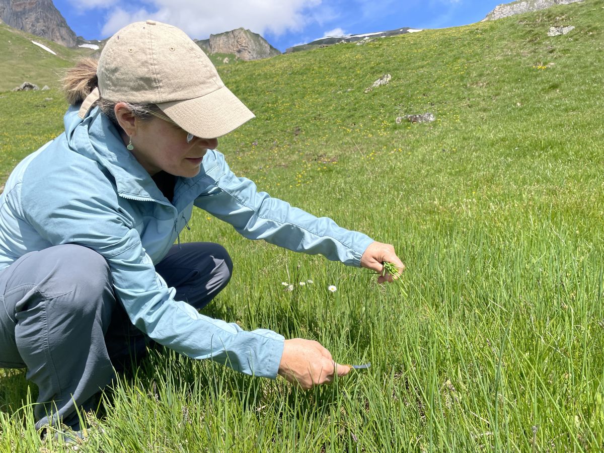 Am Morgen wandern wir von der Alp Trida oberhalb Samnaun los, über die Alp Bella, den Hang schräg hinauf auf den Spatlaskopf. Dort beginnt unser Abenteuer in den Schnittlauchgründen der Unter Malfrag. Sie sind von Weitem schon zu sehen: Dunkle Stellen in den saftig-grünen Wiesen, feuchte Abschnitte, die in der Talsohle unten an einen wild schäumenden Bergbach grenzen.