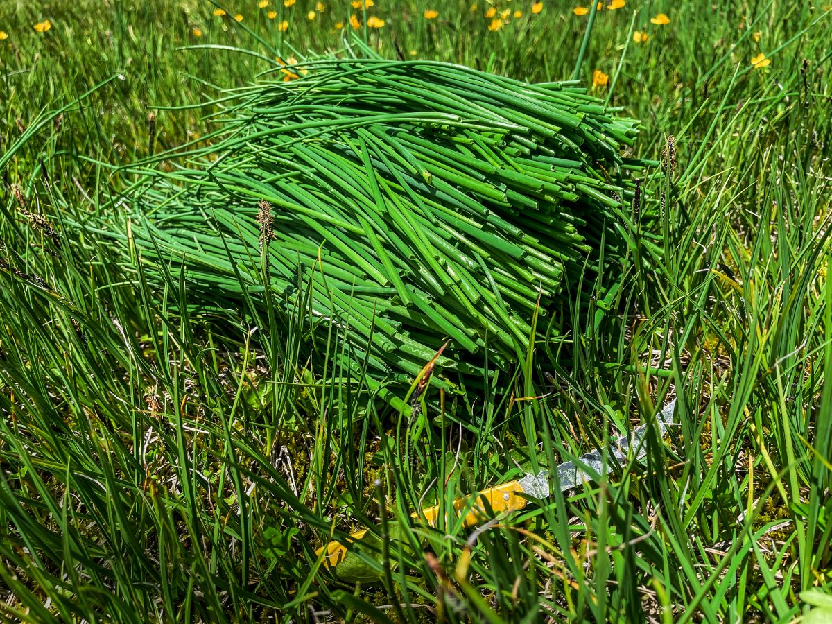 Doch erst die Arbeit. Wir krempeln die Hosen hoch, ziehen unsere Wanderschuhe aus und stehen kurz darauf barfuss im Sumpf. Thomas händigt uns kleine, gebogene Messer aus, und zeigt uns, wie wir den Schnittlauch am besten schneiden.
