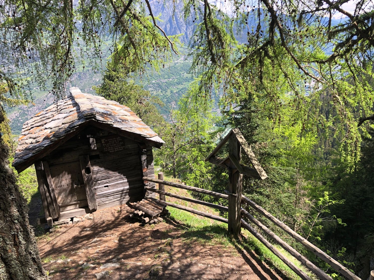 Die Wanderweg führt durch herrliche Lärchen- und Tannenwälder zum Ausblickspunkt Hüoterhüsi. Von dort aus kannst man eine wunderschöne Aussicht ins Rhonetal geniessen.