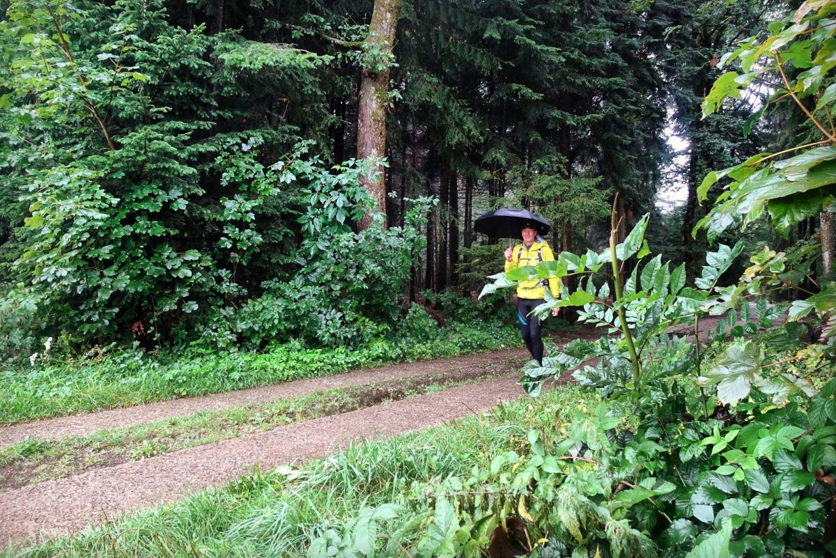 Quand il n’y a pas de vent, le meilleur équipement pour moi reste le bon vieux parapluie. Il permet de garder tout le haut du corps au sec, y compris les mains. Sous sa protection, on peut utiliser son smartphone sans difficulté. Le bonheur!