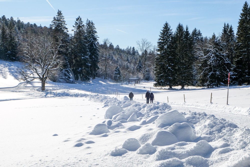 À partir d’ici, le paysage est réservé aux adeptes de la randonnée hivernale. Une éclaircie dans la forêt permet d’admirer la couronne blanche des Alpes. La vue s’étend jusqu’au Mont-Blanc. Là, au bord du chemin, se trouvent des tas de bois couverts de neige. La forêt du Chasseral est exploitée, mais c’est aussi une zone de tranquillité pour la faune sauvage. Il ne faut donc pas quitter les chemins.