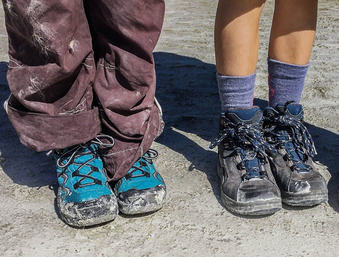 Premier point: les chaussures ne doivent pas être trop petites et les parents doivent régulièrement le vérifier. En effet, les pieds des enfants grandissent vite: environ cinq millimètres sur la longueur et deux à quatre sur la largeur tous les six mois. Durant les premières années de la vie de l’enfant, les changements sont donc fréquents, et qui dit changement dit argent. Pourtant, il n’est pas nécessaire de disposer de chaussures flambant neuves. Le fait qu’elles soient très peu portées à cet âge-là permet d’acheter des petites pointures dans une vente de seconde main ou chez les voisins. Ou de garder les chaussures pour les frères et soeurs plus jeunes, à condition d’avoir choisi une couleur neutre, ce qui, comme le montre l’exemple ci-dessus, n’est pas toujours chose facile. Enfin, la question de la durabilité entre en ligne de compte. C’est bien que plusieurs enfants puissent porter les mêmes chaussures de rando.