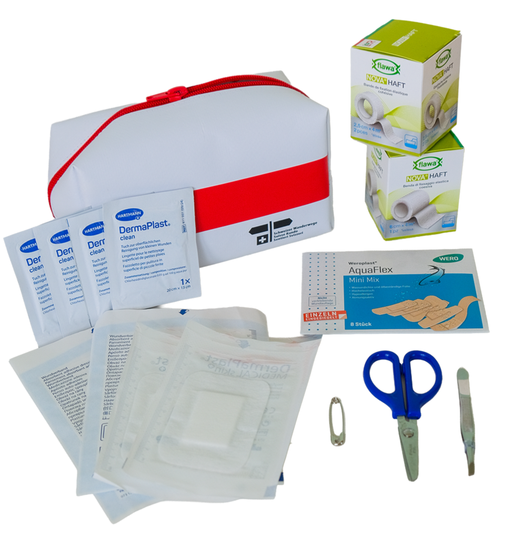En chemin, les petites blessures comme les écorchures ou les coupures arrivent vite. La pharmacie de randonnée de Suisse Rando est idéale pour ces accidents mineurs. Elle renferme un équipement de base composé d’une pince à épiler, de quatre lingettes pour nettoyer les plaies, d’un set de pansements de cinq tailles, de quatre pansements respirants, de deux bandes auto-adhésives et de petits ciseaux. Une check-list est aussi fournie pour personnaliser la pharmacie – de la place a été laissée à cet effet.