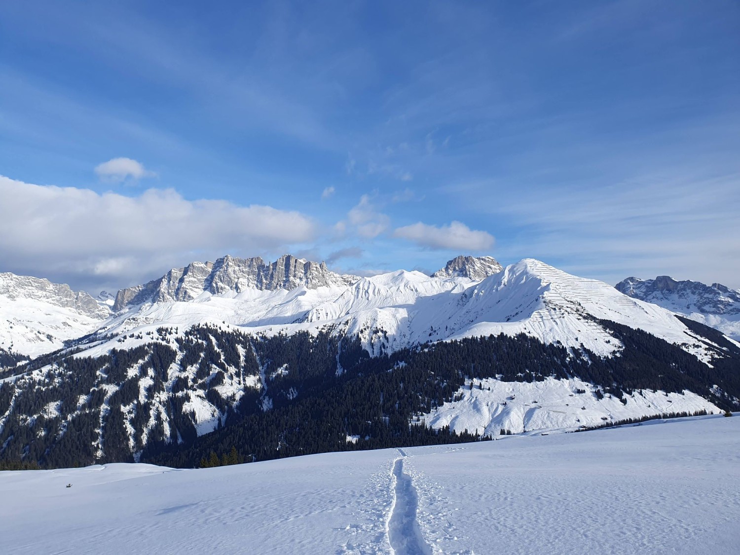 Mit dem Postauto geht es auf einer engen Bergstrasse, vorbei an heimeligen Maiensässen, hinauf zum Ausgangspunkt dieser abwechslungsreichen Schnee-schuhwanderung nach Stels Mottis. Sanft steigen wir die ersten Höhenmeter hinauf in Richtung Stelsersee. Unter der dicken Eisschicht lässt sich nur erahnen, dass hier im Sommer die höchst-gelegenen Seerosen von Graubünden gedeihen. Schon bald begleitet uns die imposante Rätikon-Kette, auch bekannt als die Bündner Dolomiten. Über einen breiten Sattel wandern wir in Richtung Gafäll, dem höchsten Punkt unserer Tour. Weite, verschneite Flächen breiten sich vor uns aus, und der Trail führt uns gemächlich bergab, zuerst zur Alp Valpun und dann weiter in Richtung Waldgrenze. Ab hier darf die markierte Spur nicht mehr verlassen werden, denn der gewalzte Weg durchquert eine Wildruhezone. Kurz darauf taucht das Walserdorf St. Antönien vor uns auf. Entlang des kleinen Skilifts erreichen wir schliesslich die Postautohaltestelle.